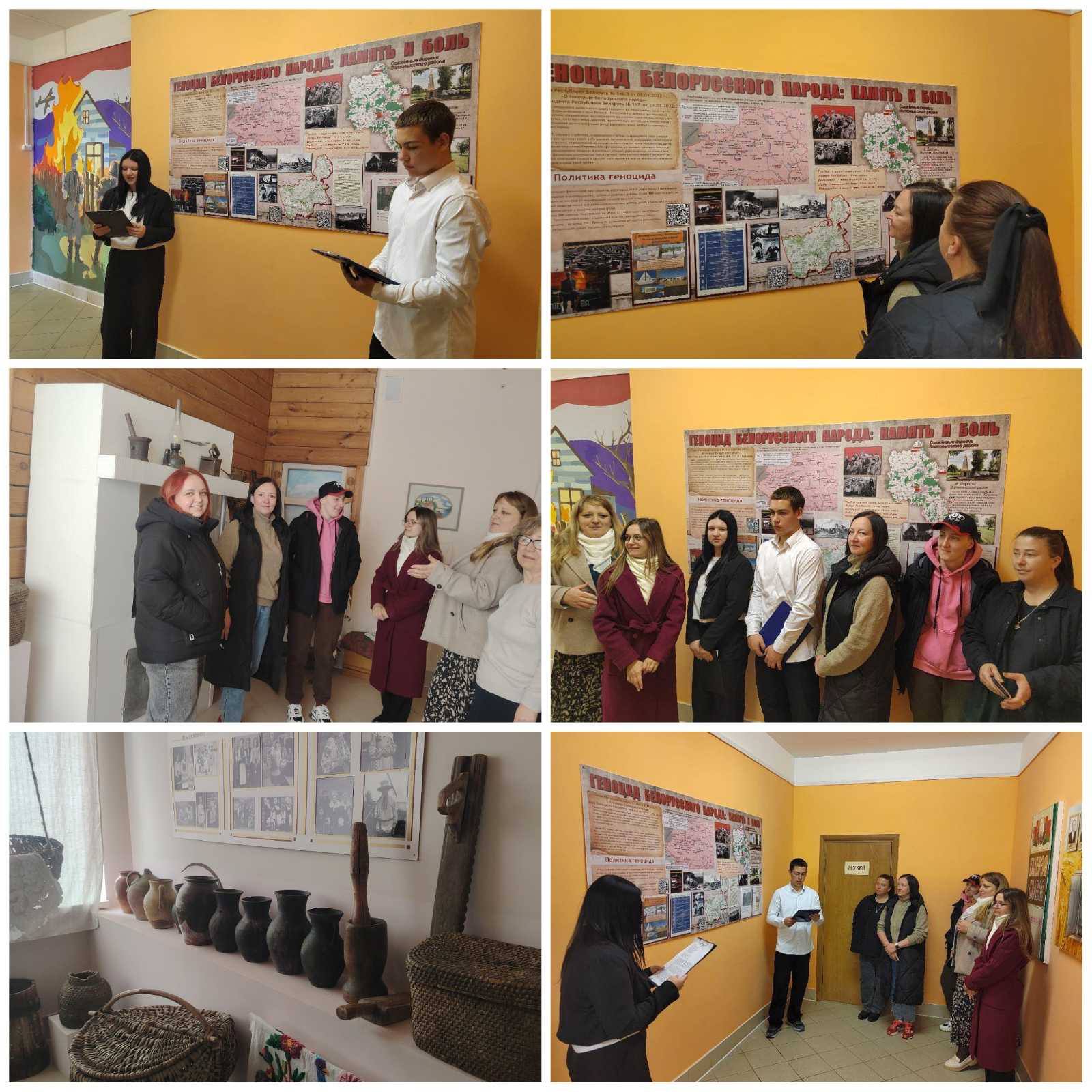 Учащиеся школы Егор Черкас и Маргарита Колиниченко зачитали для экскурсантов доклад об установленных фактах геноцида на территории Республики Беларусь, а также о судьбах узников фашистских концлагерей военного периода.