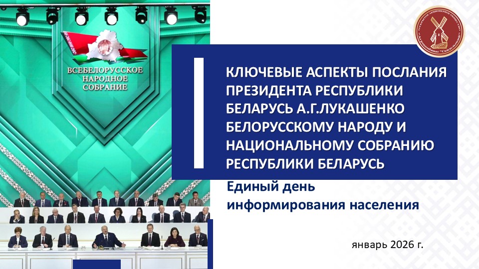 В Послании Президента А.Г.Лукашенко белорусскому народу и Национальному собранию, оглашённом на втором заседании седьмого Всебелорусского народного собрания под девизом «Время конкретных дел», подведены итоги прошлой пятилетки и поставлены десять стратегических задач на ближайшую перспективу, включая достижение технологического суверенитета, развитие энергетической самостоятельности, цифровизацию, бережливость и качество. Особое внимание уделено национальной демографической безопасности, поддержке семьи и материнства, развитию сильных регионов и укреплению обороноспособности. Утверждённая Программа социально-экономического развития на 2026–2030 годы закрепляет семь ключевых приоритетов, главный из которых — качественно новый уровень жизни каждого белоруса.